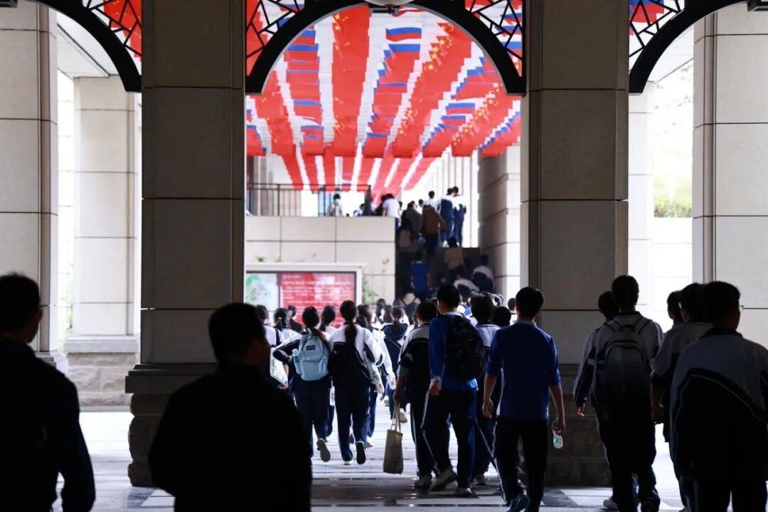 踏入北理莫斯科大学的校园,庄严的国旗与校旗迎风飘扬。学子们身着整齐的校服,在国旗下有序列队,与来自俄罗斯的外教、留学生共同定格下一张意义非凡的合照。蓝白相间的校园建筑洋溢着浓郁的俄式风情,金发碧眼的外国友人微笑着挥手致意,不同语言的问候在此刻交融,让同学们深切感受到这所中外合作高校的国际化氛围。阳光洒在一张张年轻的脸庞上,国旗的鲜红与校园的静谧相映成趣,这份跨越国界的相聚,为本次探访写下了温暖的开篇。